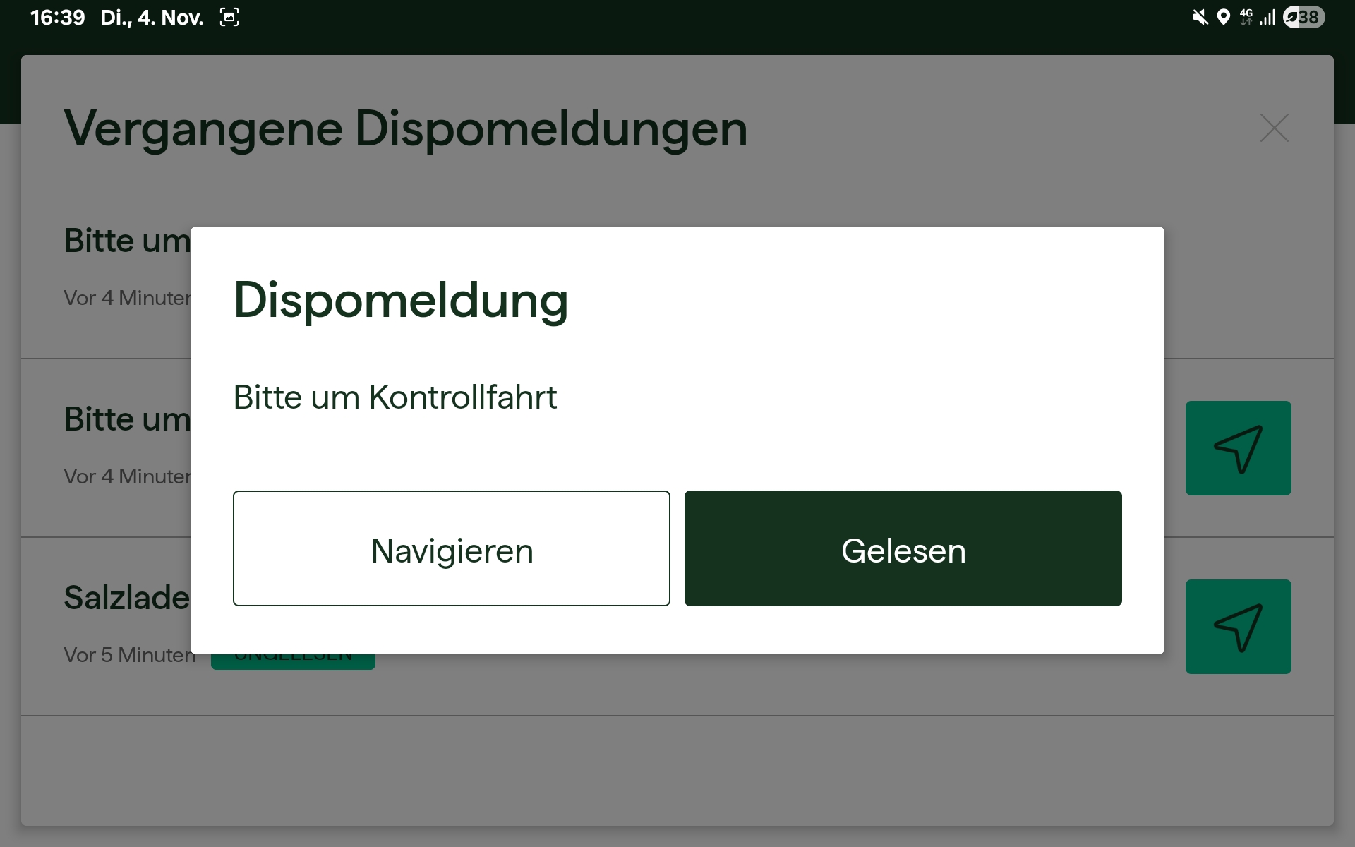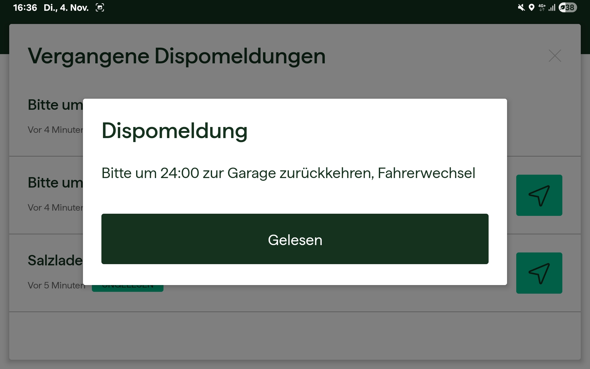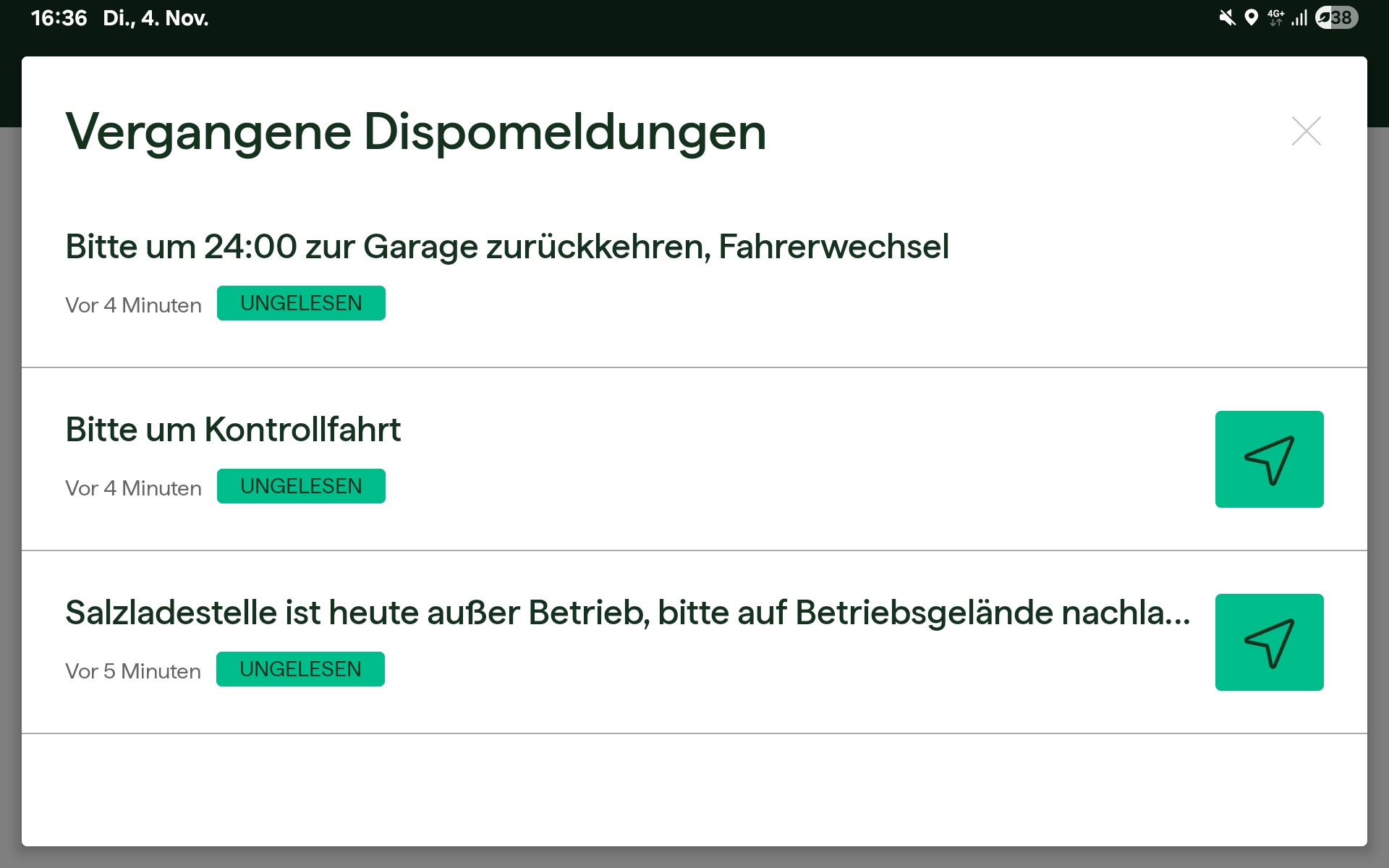 Im angezeigten Dialog werden alle ungelesenen Dispomeldungen sowie gelesene Dispomeldungen dargestellt, die innerhalb der letzten 12 Stunden erstellt wurden. So behalten Fahrer:innen jederzeit den Überblick über aktuelle und kürzlich erledigte Dispomeldungen.
