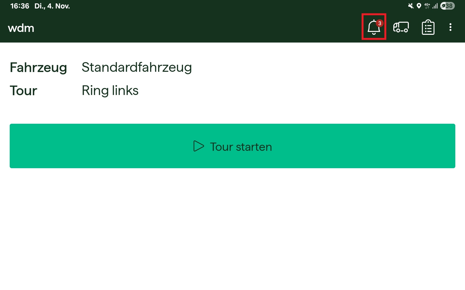 Wird eine Dispomeldung von der Disposition an die wdm app übertragen, wird der:die Fahrer:in mittels Sprachausgabe und einem Text am unteren Bildschirmrand darüber informiert, dass eine neue Meldung empfangen wurde. Anschließend können die Dispomeldungen durch das Tippen auf das Glocken-Symbol bearbeitet werden. Eine Dispomeldung besteht aus einem Text und optional einer Position, zu der Navigiert werden kann.