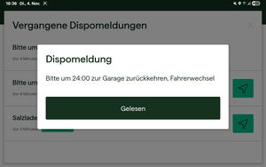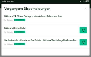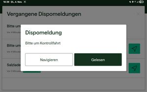 Im Dialog werden alle ungelesenen Dispomeldungen sowie alle gelesenen Dispomeldungen angezeigt, die innerhalb der letzten 12 Stunden erstellt wurden. Durch Antippen einer Dispomeldung öffnet sich die Detailansicht, in der die Meldung als gelesen markiert werden kann. Wenn eine Dispomeldung mit einem Standort verknüpft ist, kann direkt aus dieser Ansicht die Navigation dorthin gestartet werden – entweder über die grüne Navigationstaste in der Detailansicht oder über die Navigationstaste neben der Meldung in der Übersicht.